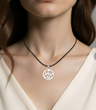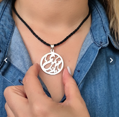 Colgante personalizado en plata 925 con nombre en árabe, elaborado artesanalmente en Egipto. Incluye cordón de cuero. Elegante, significativo y auténtico, ideal para regalar o lucir con estilo